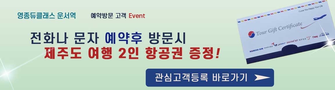 공실없는 운서역 오피스텔! 영종 듀클래스 운서역 관심고객등록 회사 보유분 파격! 할인분양 신축오피스텔 잔여분 특별공급 운서역도보 3분 초역세권 1억이하 주택수 미포함 1.5룸 2룸 풀옵션 기본제공 안정 월수익·확정임대수익보장 1억대·실투자금 3,000만원 | 입지여건 | 설계특화 | 동·호배치도 | 평면안내 관심고객등록 이름 (필수) 전화번호 (필수) 개인정보 수집 및 이용에 동의합니다. ※개인정보 수집및 이용에 관한안내 “영종듀클래스운서역”은 고객님 들에게 분양에 필요한 정보 이용을 위해 필요한 최소한의 범위로 개인정보를 수집합니다. 관심고객등록을 통하여 아래와 같은 개인정보를 수집하고 있습니다. 수집항목 : 이름, 휴대전화번호 수집방법 : 홈페이지 관심고객등록을 통한 개인정보 수집/이용, 개인정보 처리위탁의 내용에 대해 각각 「동의」버튼 또는「비동의」버튼을 클릭할 수 있는 절차를 마련하여, 각각의 「동의」버튼을 클릭하면 해당 사항을 동의한 것으로 간주합니다. 개인정보의 수집 및 이용목적 개인정보 항목별 구체적인 수집 및 이용목적은 다음과 같습니다. 이름, 전화번호 : 분양정보및 분양상담등 안내를 위해 제공받고 이용목적이 달성된 후에는 해당정보를 지체없이 파기합니다. 개인정보 수집 동의 거부권 : 모든 고객은 동의를 거부할 수 있으며, 동의를 거부할 경우 관심고객 등록이 불가합니다.